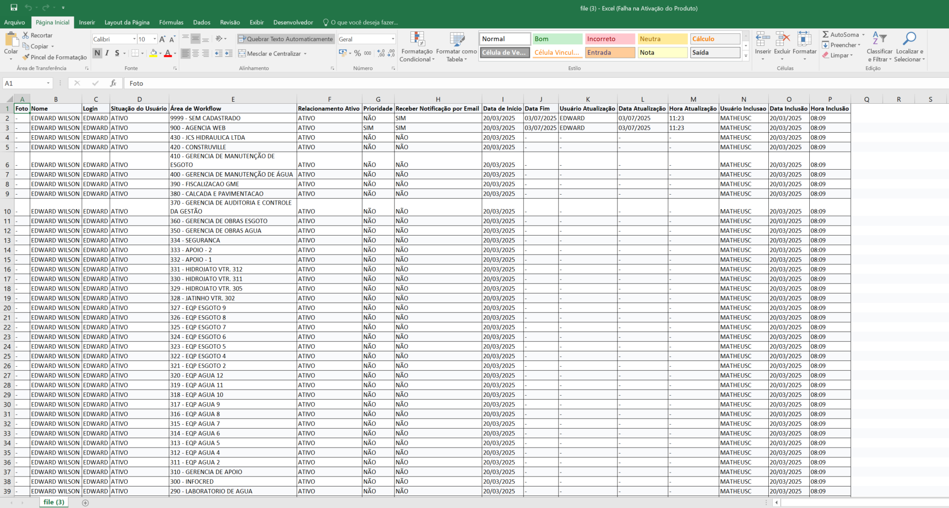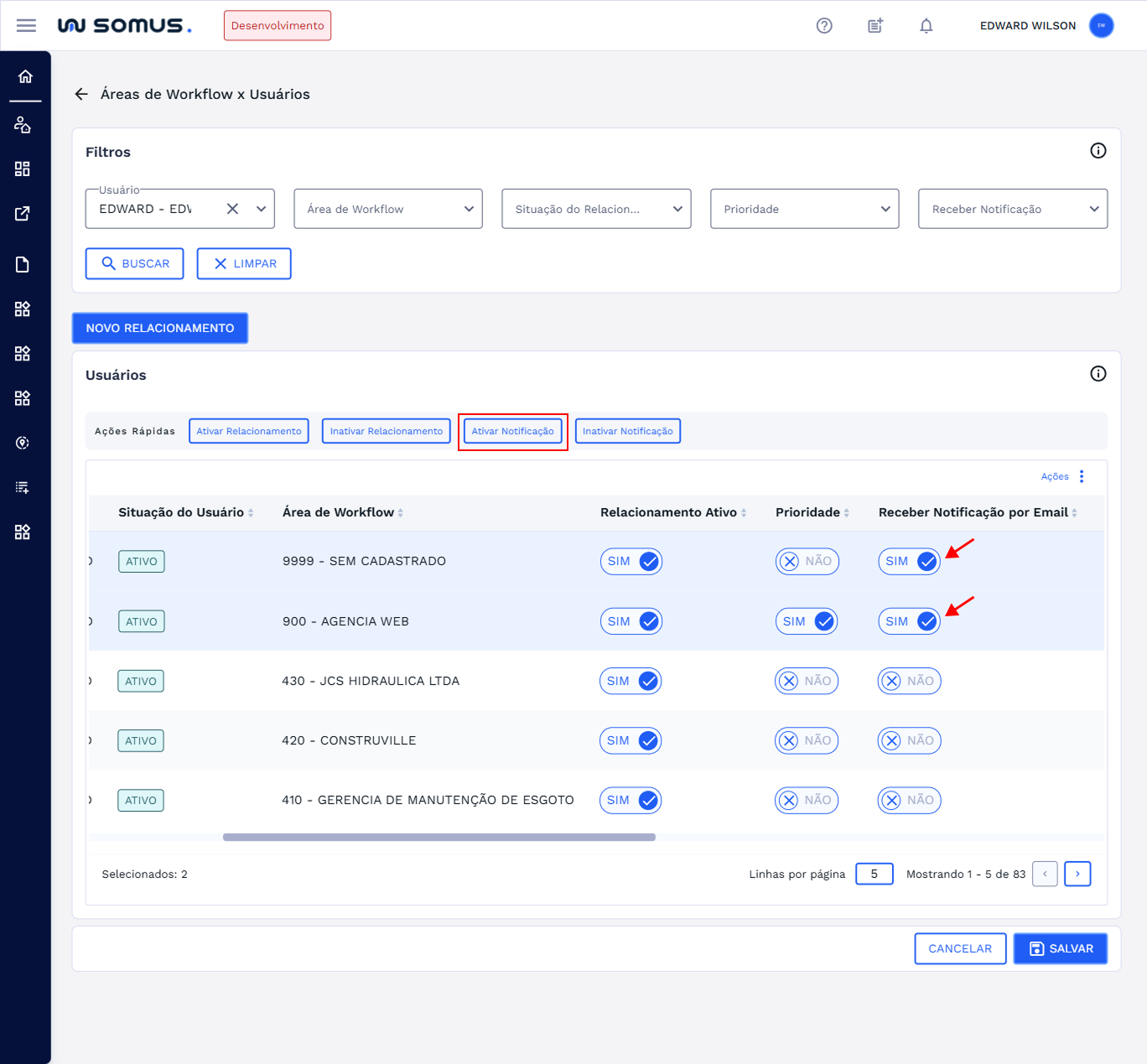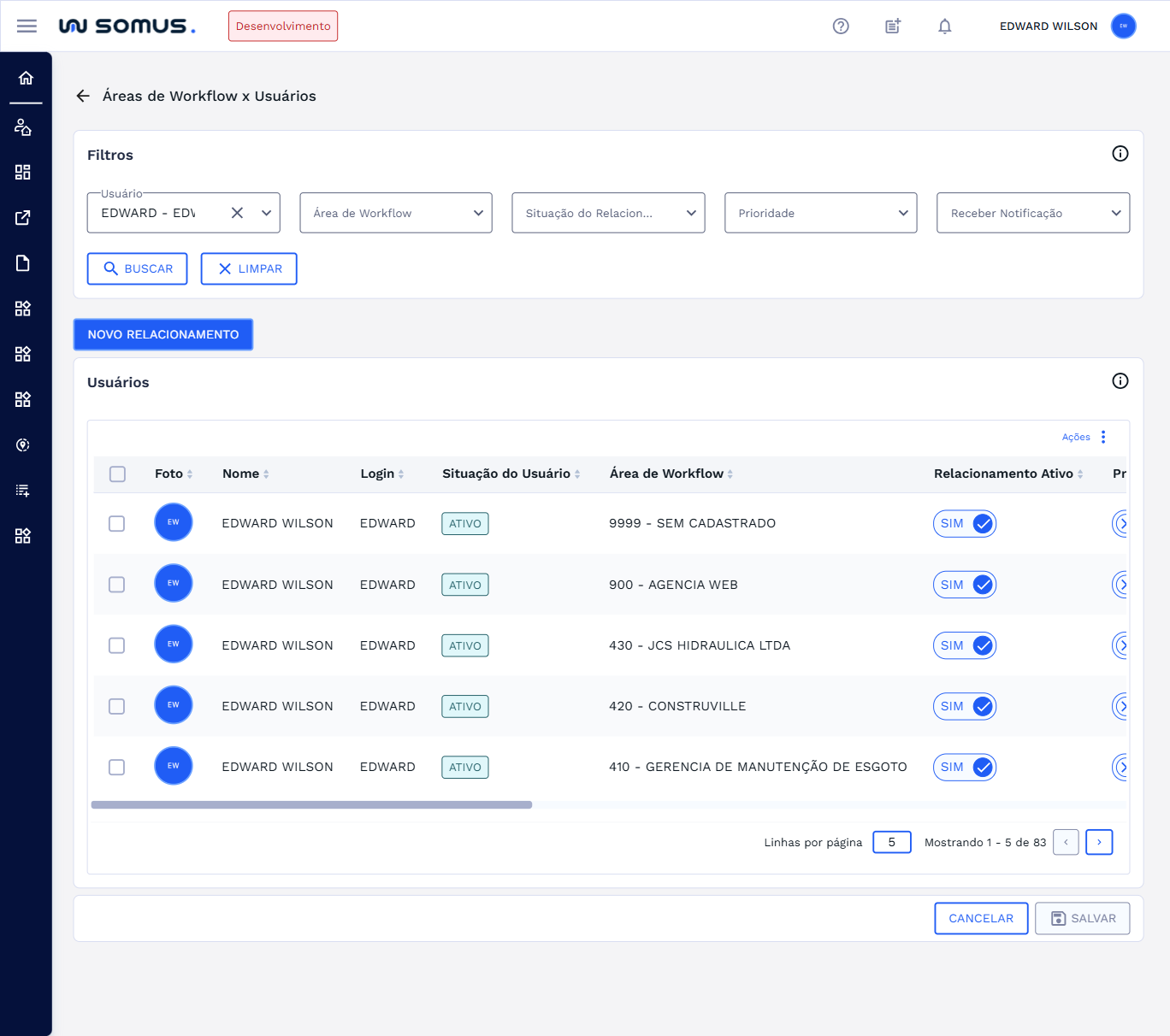 Após realizar a busca o sistema irá listar o usuário selecionado e todas a suas áreas de workflow relacionadas. Conforme a imagem abaixo: