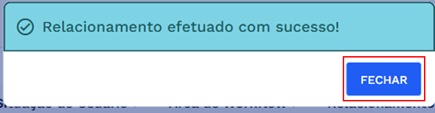 Após clicar em “SALVAR” será aberta uma janela de confirmação, clique em “CONFIRMAR” para continuar e salvar o relacionamento. Caso deseje retornar basta clicar em cancelar, o sistema retornará para a tela de relacionamentos.