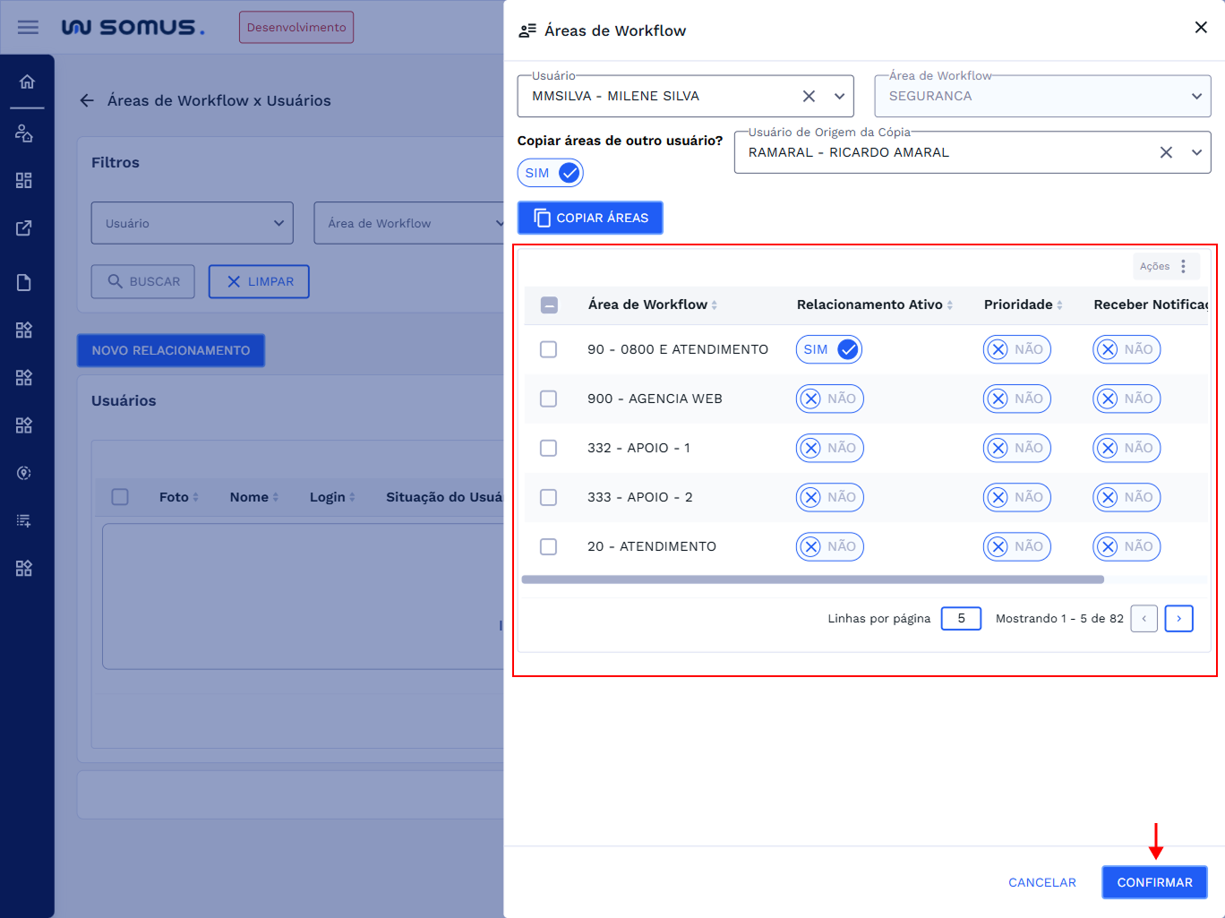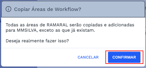 Agora todas as áreas do usuário de origem foram inseridas para o usuário de destino, para continuar clique em “CONFIRMAR”.