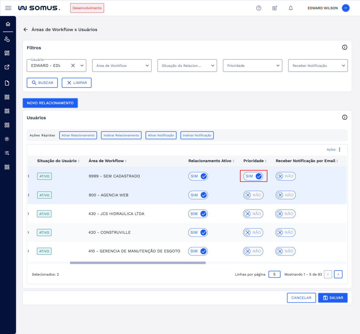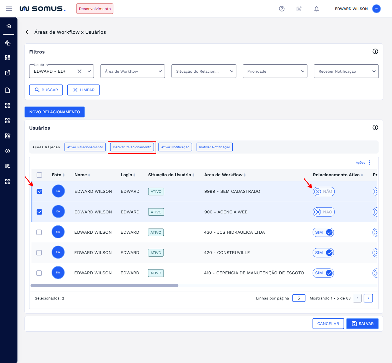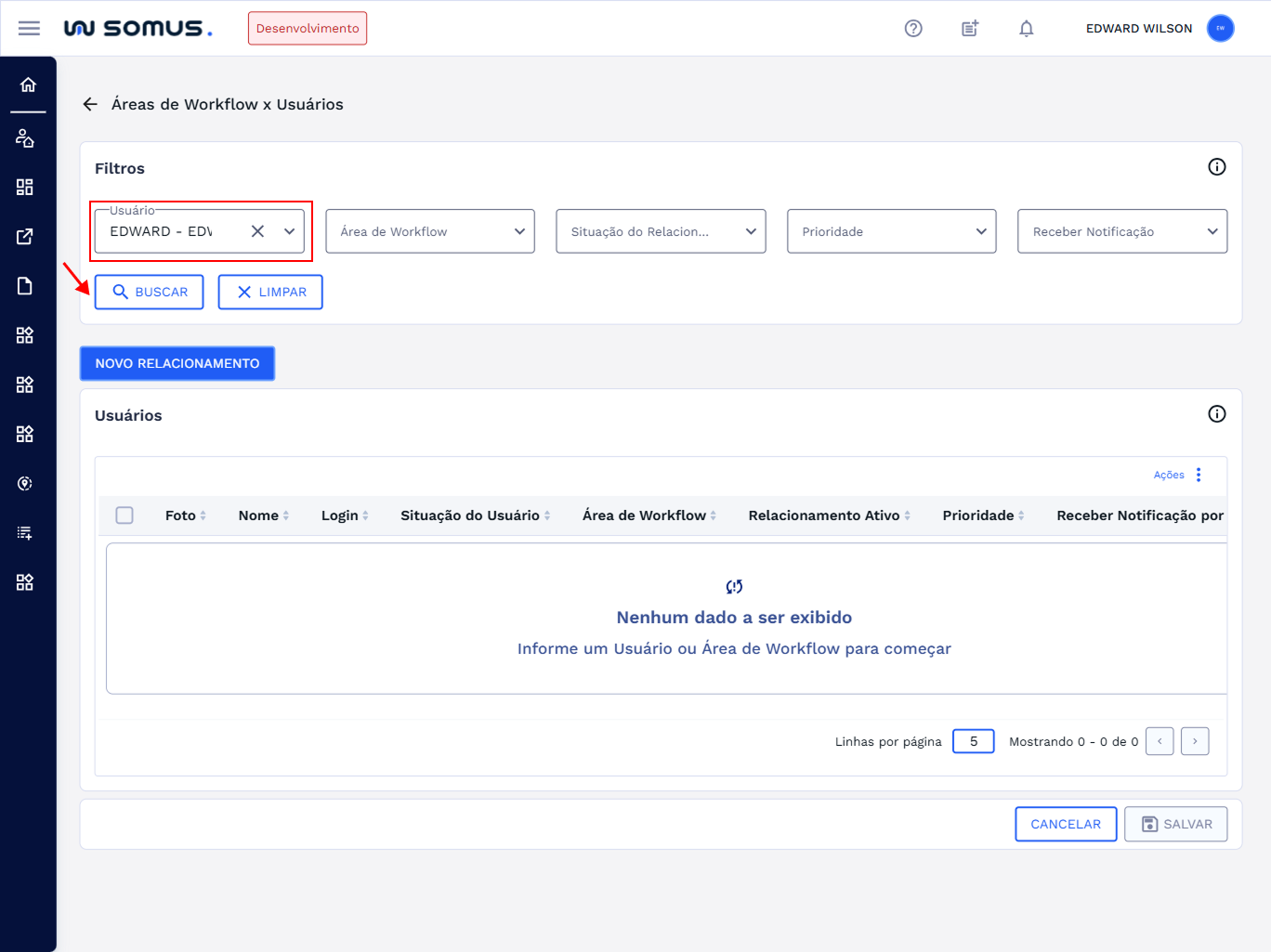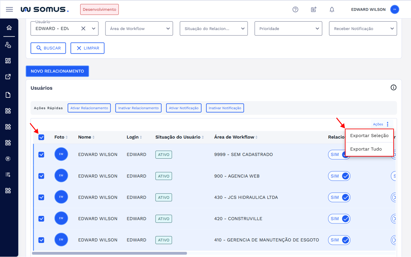 Principais ações que os usuários poderão executar ao acessar a funcionalidade de Relacionamento de Área de Workflow x Usuários