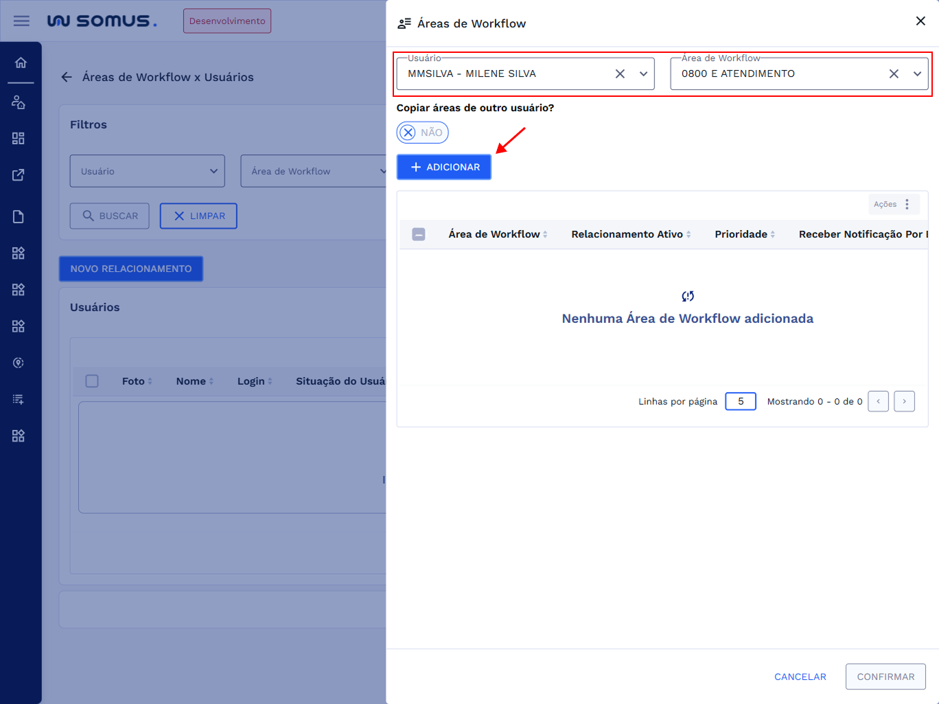 Selecione o usuário e a área que deseja adicionar para esse usuário e na sequência clique em “ADICIONAR”, imagem abaixo: