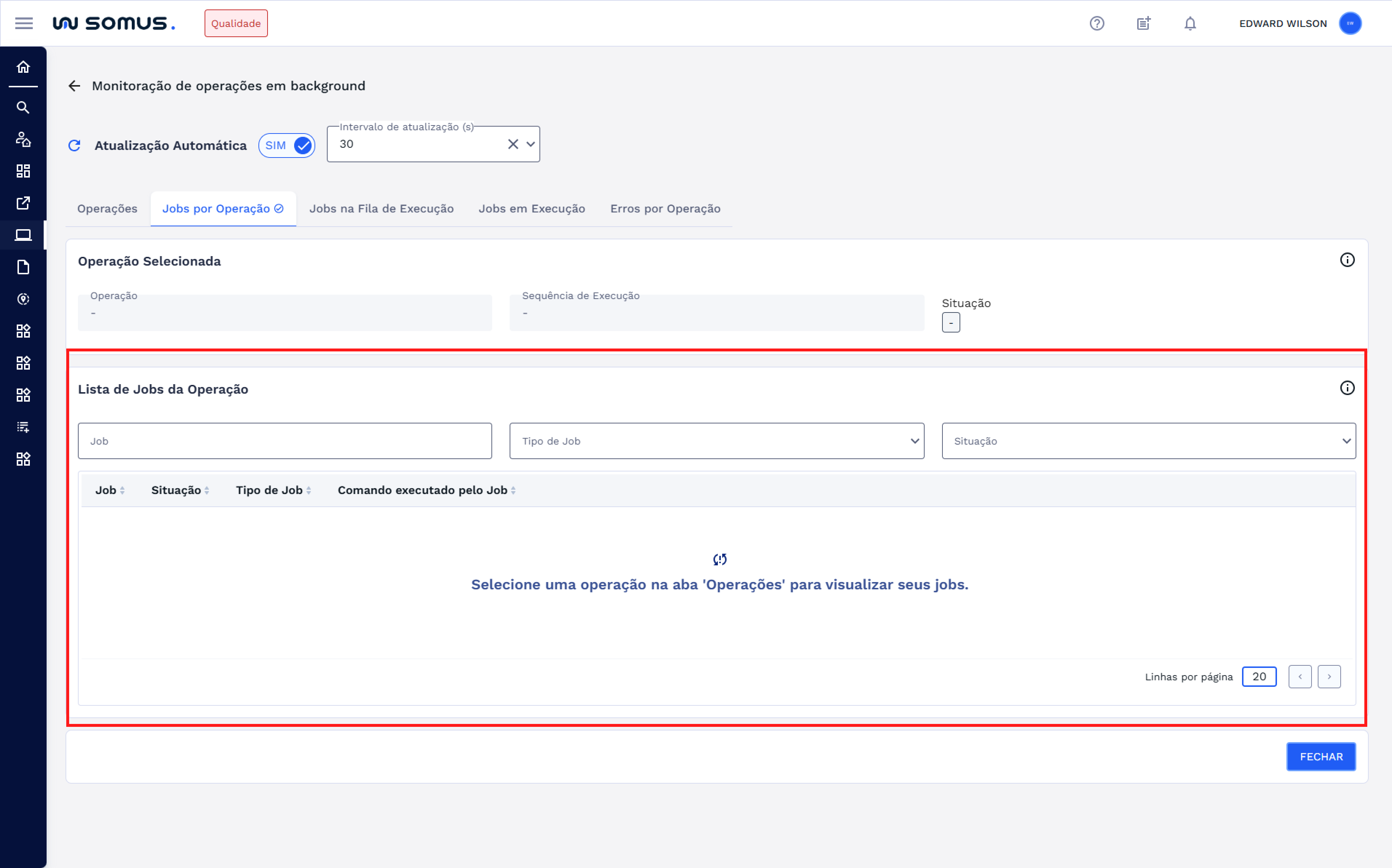 A aba Jobs por Operação exibe as micro tarefas vinculadas à operação selecionada na aba Operações. Portanto, se nenhuma operação for selecionada, essa aba permanecerá vazia.
