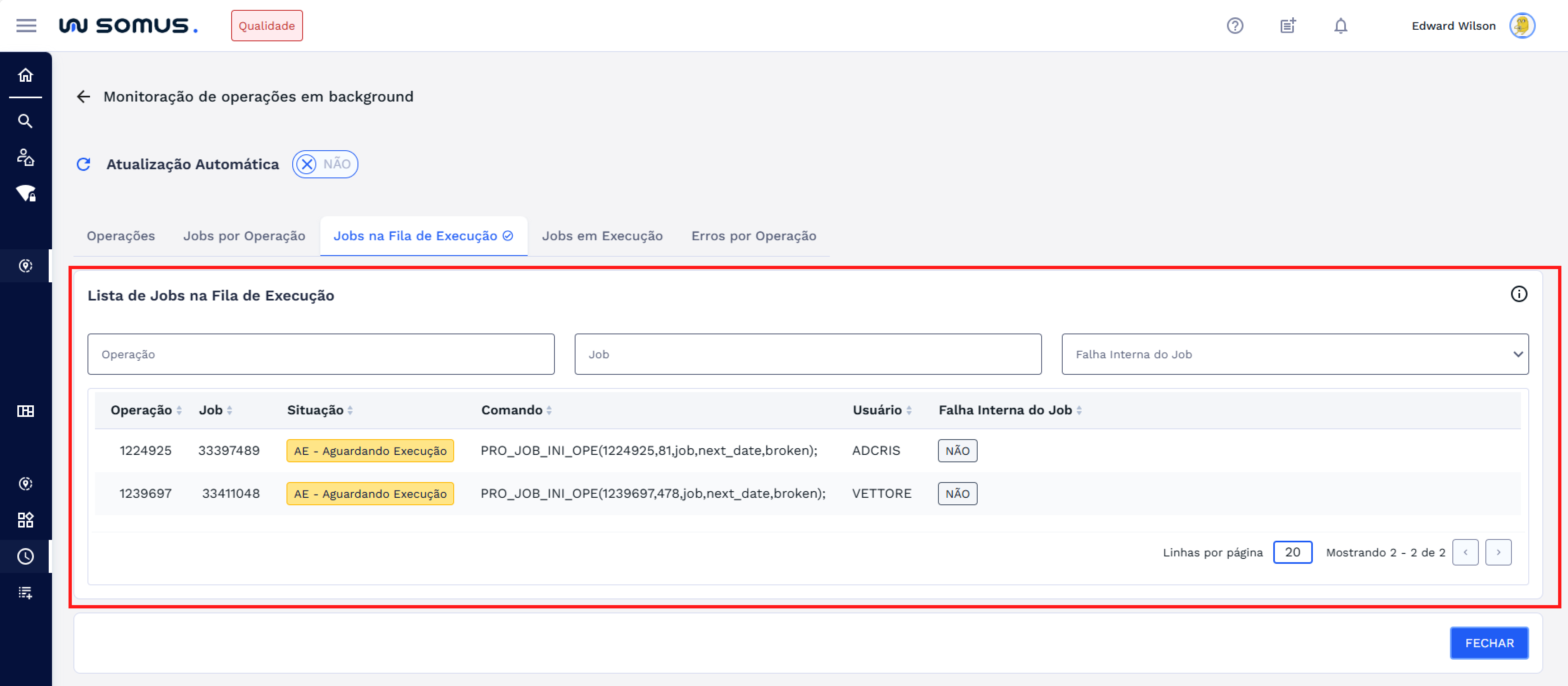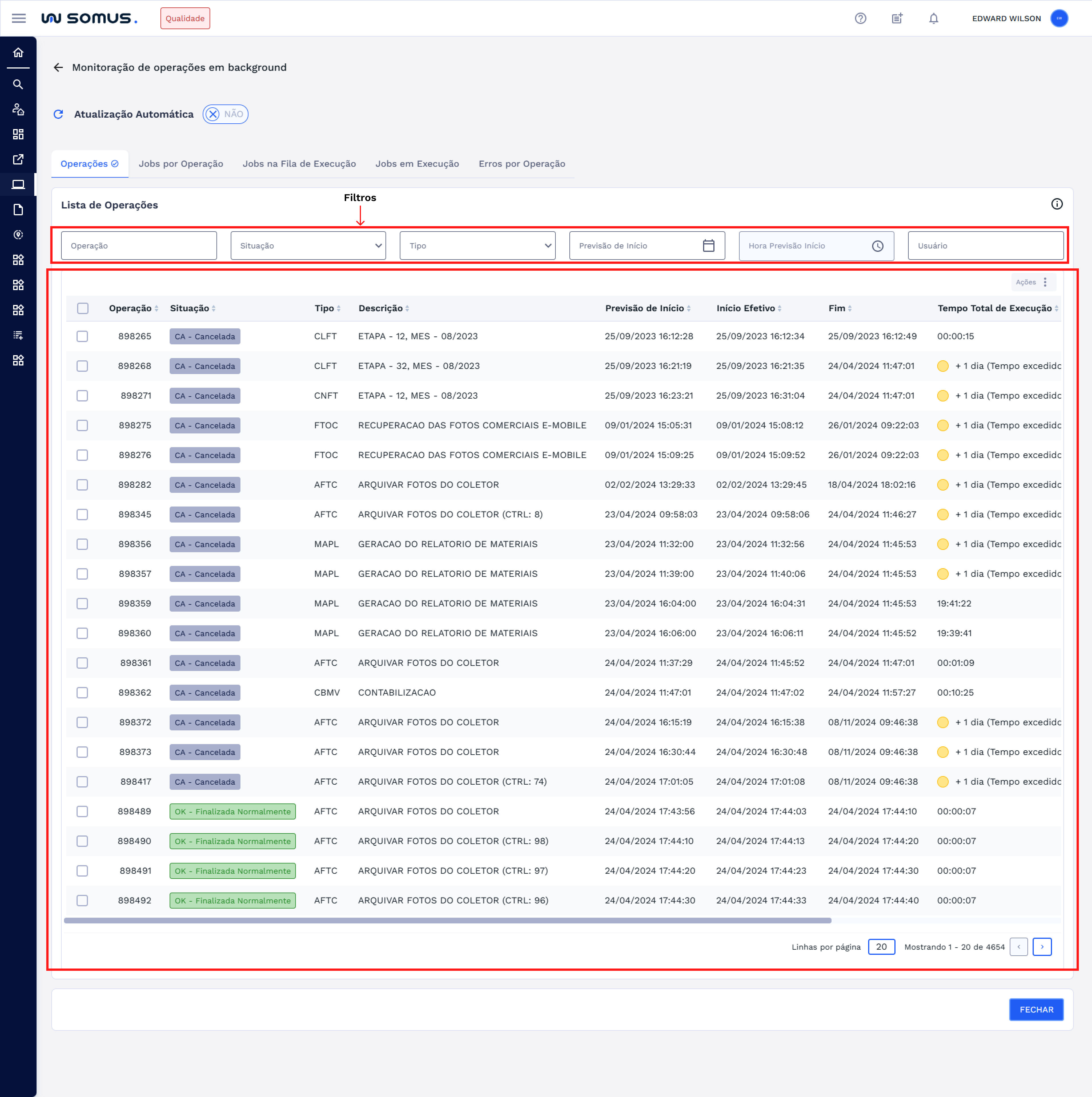 Na tabela, serão exibidos os jobs em execução com a possibilidade de aplicar filtros para facilitar a visualização, como: job específico, operação, tipo e usuário.