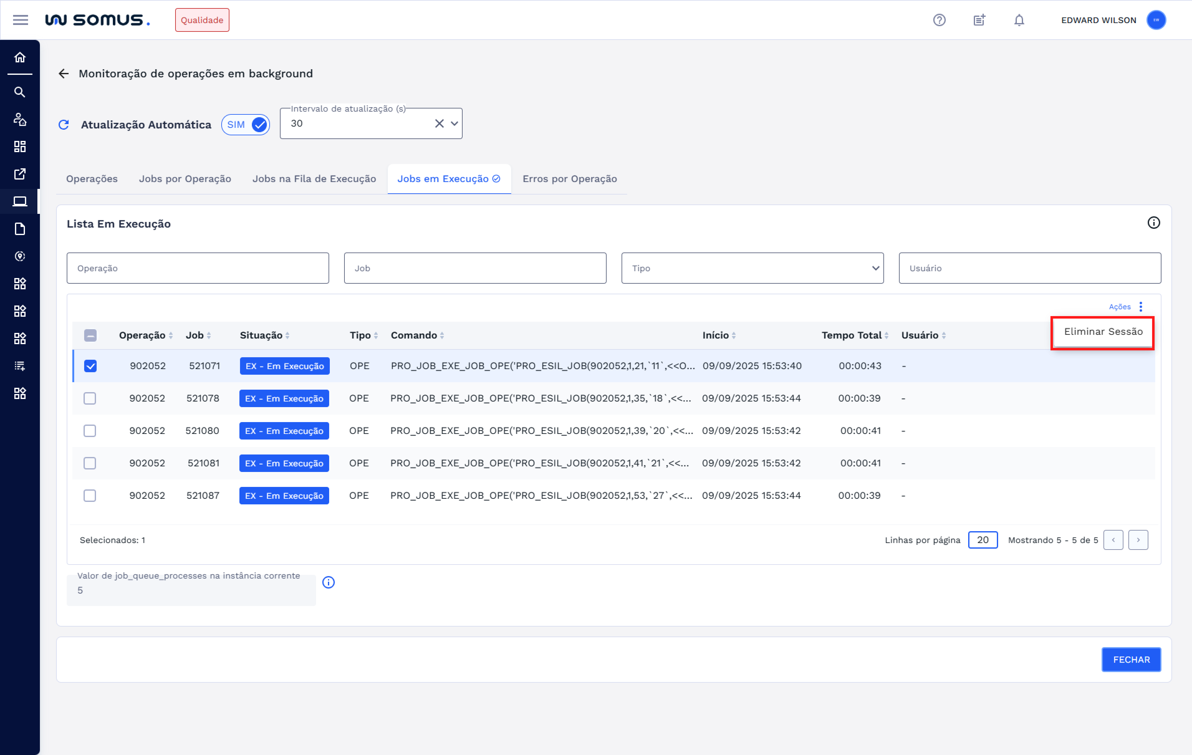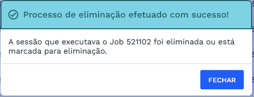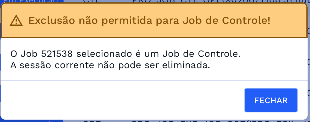 Será possível eliminar a sessão do usuário que criou a operação em segundo plano. Ao eliminar a sessão, todas as operações associadas a ela também serão encerradas, com exceção dos jobs do tipo CTL - Controle, que permanecerão ativos