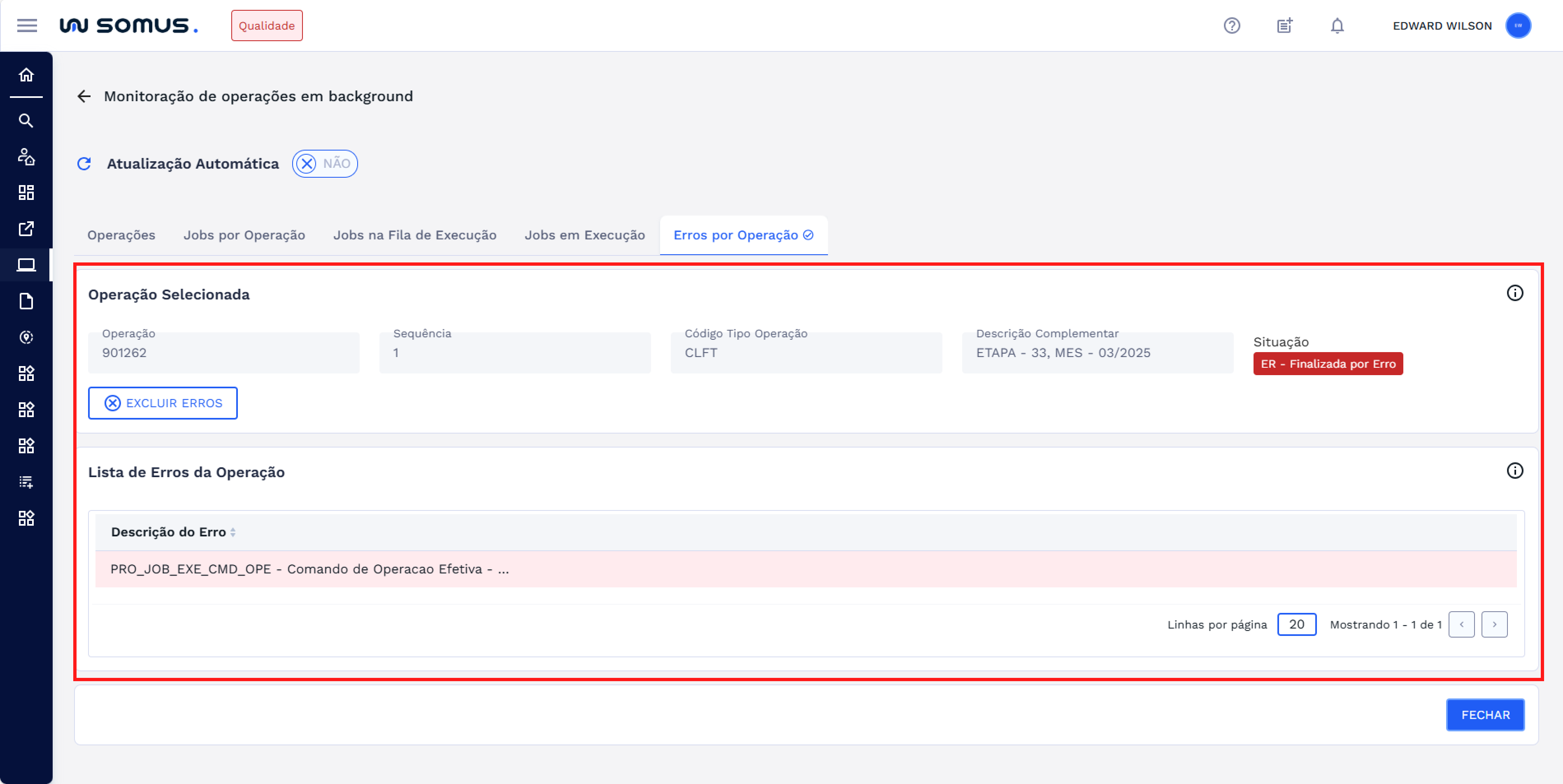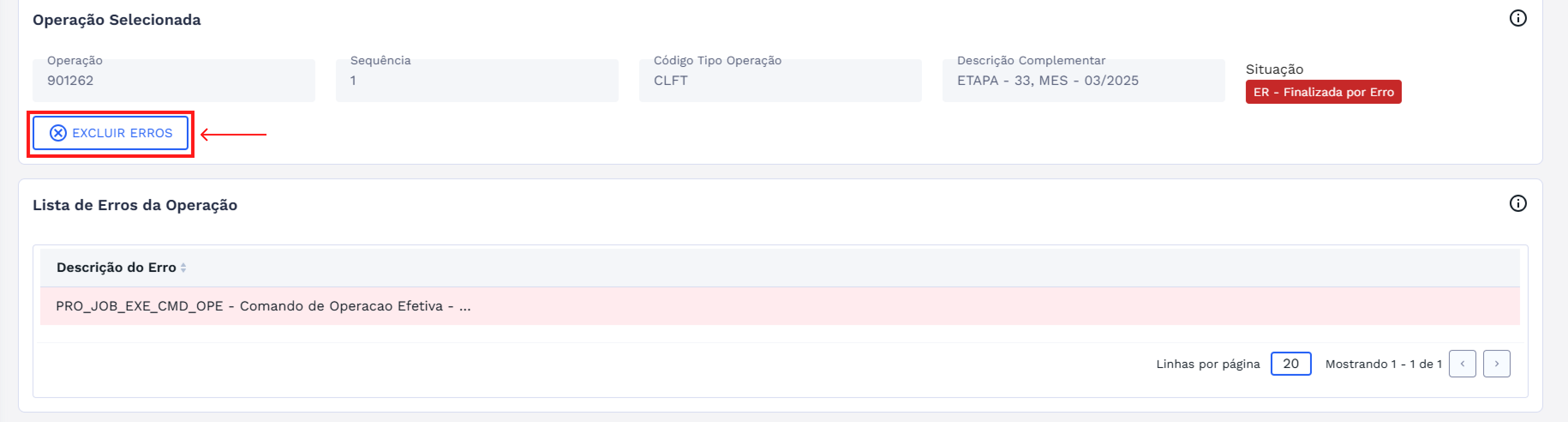 Para operações que já estão finalizadas, é possível excluir os erros. Para realizar a exclusão, é necessário desligar a atualização automática. Após isso, clique no botão EXCLUIR ERROS logo abaixo dos detalhes da operação selecionada.
