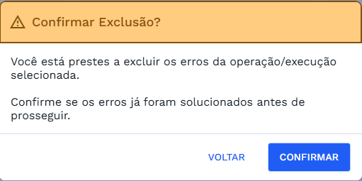 Após clicar no botão, será aberta uma janela de confirmação, clique em CONFIRMAR para excluir os erros. Caso deseje retornar basta clicar em VOLTAR e o sistema retornará para a tela de Monitoração.