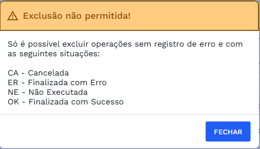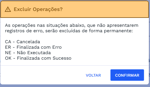 ⚠️ Importante: Mesmo ao selecionar todas as operações, somente aquelas que estiverem nas situações listadas acima serão efetivamente excluídas.