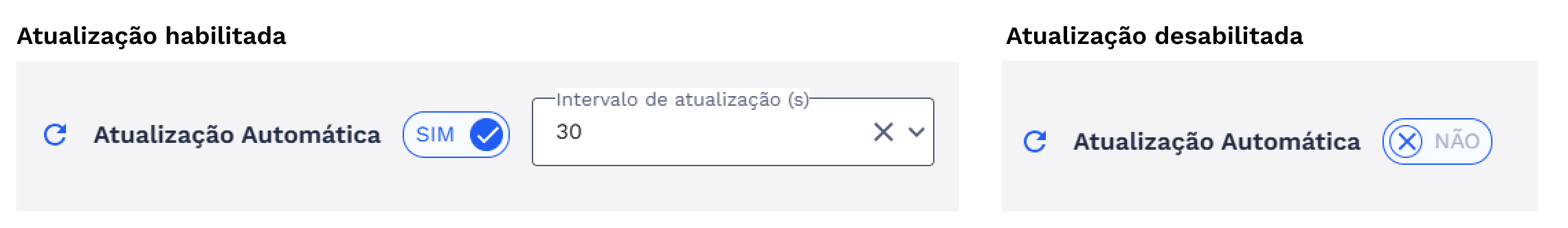 Enquanto a Atualização Automática estiver ligada, o usuário pode escolher outro intervalo de tempo para a atualização acontecer. As opções disponíveis vão de 10 em 10 segundos, começando em 10 segundos e indo até o máximo de 60 segundos. Esse controle só fica disponível quando a Atualização Automática está ativada. Se o usuário desligar essa função, o seletor de tempo será desabilitado automaticamente.